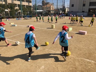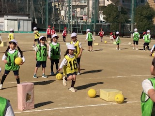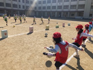 1年生の子どもたちが運動場で[まと当てゲーム遊び]をしていました。グループの間にはダンボール箱で作ったまとが置いてあります。まとには色紙で飾ったりキャラクターの絵を貼ったりして、子どもたちの意欲をさらに引き出すよう工夫してありました。前半戦と後半戦に分かれてまとを狙ってボールを蹴り合います。まとに当てると得点が入ります。足でボールを蹴るので思ったように転がらないところもおもしろいところです。子どもたちは得点が入ると手をたたいて喜び合っていました。太陽の日差しを浴びながら、ほのぼのとした体育授業の一風景です。
