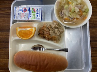 今日の給食のメニューは、押麦のグラタン、スープ、デコポン、牛乳、パンでした。押麦のグラタンはまろやかなホワイトソースに鶏肉と押麦、玉ねぎ、マッシュルームが包み込まれていました。押麦には食物繊維が多く含まれています。スープはチキンスープをベースに塩こしょう、醤油で味をととのえ、豚肉の旨みもしっかりと効いていました。細かく刻まれた野菜もたくさん入っていました。デコポンは果汁たっぷりで、一人1/4カットです。