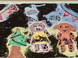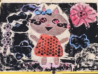 2年生の子どもたちの図工の作品が教室の後ろに掲示してありました。プチプチ(気泡緩衝材)や波段ボールを活用した紙版画です。素材の特徴を生かしてとても不思議感が出ています。黒色だけでなく他の色も使うことで幻想的な雰囲気もありますね。宇宙からやって来た生き物という感じがしないでもないです。何の生き物をイメージして作ったのかは子どもたちに聞いてみないとわからないところがこの作品のおもしろさでもありますね。