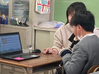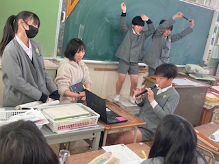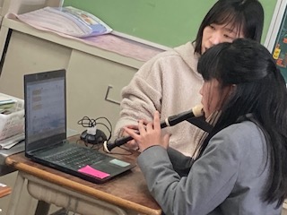 昨日は6年生がリコーダーのテストをしていましたが、今日は5年生の子どもたちがリコーダーのテストを受けていました。一人ずつ先生の横でパソコンの楽譜を見ながら吹いていきます。待っている間は音を鳴らさずに指づかいの練習をしながら待ちます。吹き終わったら一人一人に良かったところや感想をきちんと伝えてあげている先生の姿がありました。さすがです。そしていつの間にか後ろにはリコーダーの音色に合わせて踊る応援隊の姿も…。こちらもさすがです。思わず先生の笑みがこぼれていました。