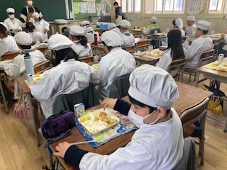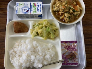 今日の給食のメニューは、カツ丼、キャベツの梅風味、芋けんぴフィッシュ、牛乳でした。カツ丼はごはんの上に衣がサクッと揚げられた一口トンカツを添えて、出汁が効いた卵とじをかけて食べます。子どもたちにも好評なメニューです。キャベツの梅風味は梅肉と米酢を使ったさっぱりとしたドレッシングでキャベツを和えています。芋けんぴフィッシュは芋けんぴと小魚が入っています。芋けんぴとはさつまいもを細長く切って油で揚げて砂糖蜜をからめた高知県の名物菓子です。