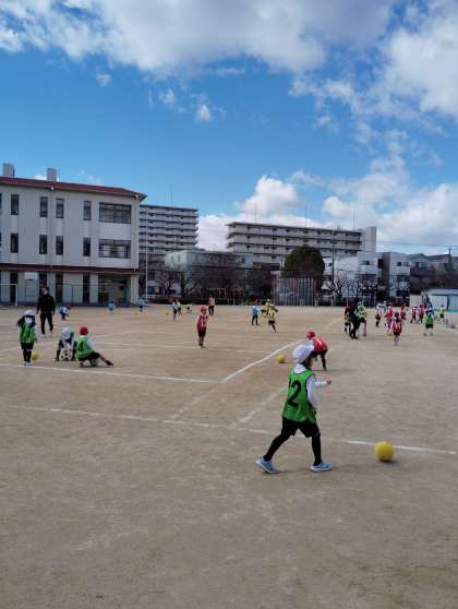 3時間目、1年生が体育の学習をしています。1時間目のテストの時とはうって変わって、とっても元気な声が聞こえてきます。今日はとても寒いですが、誰一人寒いなんて言っていません。必死にボールを追いかけいます。先生たちも負けじと大きな声で指示を出しています。みんな、頑張れ!