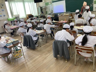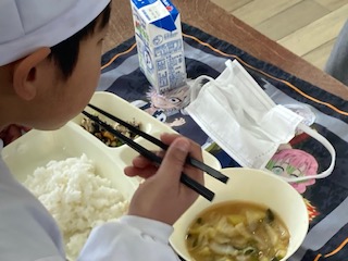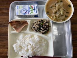 今日の給食のメニューは、赤魚のレモン醤油かけ、さつまいものみそ汁、高野豆腐のいり煮、牛乳、ごはんでした。赤魚のレモン醤油かけは料理酒で下味をつけた赤魚を焼き物機で香ばしく焼き、生レモンを使った甘めの醤油ベースのたれをかけています。身も厚くふっくらとしていました。さつまいものみそ汁はさつまいもを中心に野菜がたくさん入っていました。高野豆腐のいり煮は豚挽き肉の旨みを生かして、にんじんとグリンピース、ひじきを加えることで彩りをよくしています。