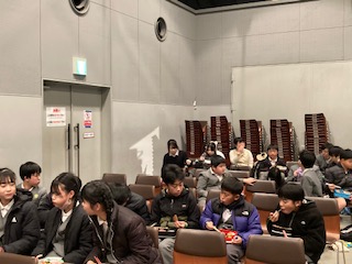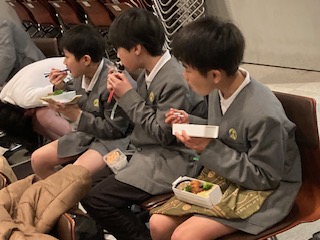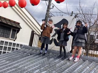 瓦屋根の上にのぼってハイポーズ!ちょっとだけ忍者気分ですね。お腹もすきました。お楽しみのお弁当はグループ毎に時間を決めてそれぞれで食べるシステムです。外で食べてもいいのですが、室内を貸してもらえました。食べたらすぐにまた出発です。みんな食べながら次の行動予定を話し合っていました。『迷路にする?それとももう一回お化け屋敷…?』