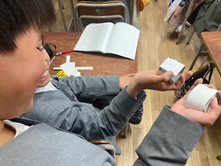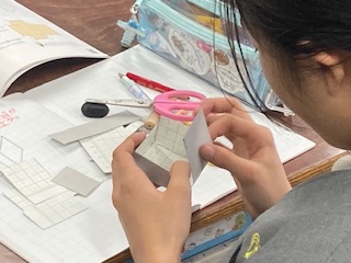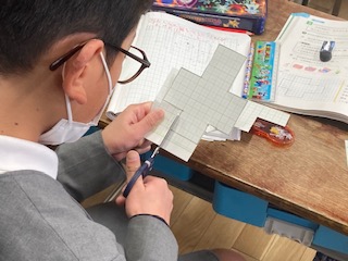 4年生の子どもたちが算数の授業で直方体を作っていました。直方体を作るには何がわかればいいのかな。まずはたての長さと横の長さ、それから高さも決めてと…。そして展開図を描きます。1枚目の写真の展開図は子どもたちが一般的によく思い浮かべる展開図です。実は他にもまだ何種類かあるので、ぜひチャレンジしてみてほしいと思います。子どもたちは描いた展開図を切り取り、直方体の箱を組み立てていきます。みんな上手に組み立てることができていました。