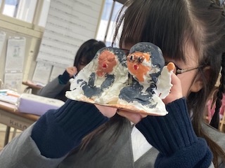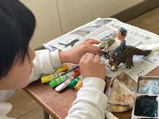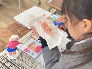 2年生の子どもたちが紙ねんどを使って工作をしていました。テーマは[一年間の思い出]だそうです。この一年をふり返って楽しかったことや印象に残ったことなどの思い出の一場面を表現するということです。作品を作っている子どもたちの小さな手がとてもかわいらしいです。紙ねんどで形を作り、絵の具で色をぬっていきます。見ただけでは何の思い出の場面なのかはわからないものが多いので、子どもたちに聞いて回るのが楽しかったです。