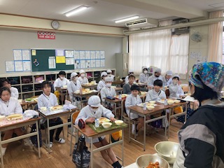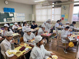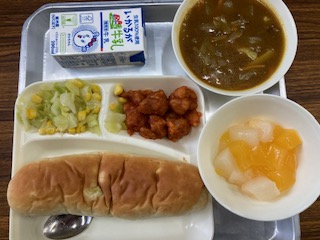 今日の給食のメニューは、揚げ鶏のバーベキューソース、カレースープ、キャベツとコーンのサラダ、フルーツゼリー、牛乳、パンでした。今日の給食は[卒業お祝い献立]となっています。いつもよりもメニューが一品多く、見た目も少し華やかになっています。6年生の子どもたちも『なんか今日ちょっと豪華やなぁ』とつぶやいていました。