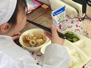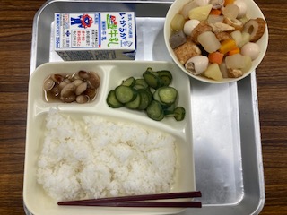 今日の給食のメニューは、関東煮、きゅうりの梅風味、とら豆の煮物、牛乳、ごはんでした。関東煮はだしが具材に十分にしみ込み、関西でいうおでんのようなものです。今日は少し寒いので体が温まりました。きゅうりの梅風味は梅肉を使った調味液がさっぱり感を感じさせてくれます。とら豆の煮物は上品な甘さでふっくらとやわらかく煮られていました。とら豆のおもな産地は北海道で、豆の模様が濃い黄褐色と薄茶色で動物のトラに似ている模様がある豆です。たんぱく質やカルシウム、食物繊維が多く含まれています。