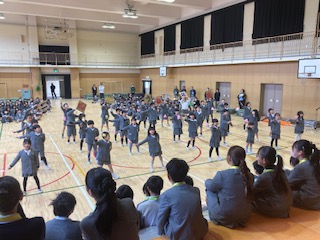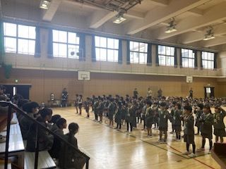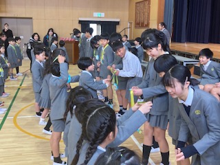 本日午前中に[卒業生を送る会]を行いました。講堂に全校児童が集まり児童会が中心となって、3月18日に卒業する6年生のお兄さんお姉さんたちをみんなでお祝いしました。残念ながら1〜4年生は18日の卒業式には出席できません。だから今日が全校児童全員での卒業式となります。各学年の子どもたちが心のこもった歌やお祝いメッセージのプレゼントを6年生に贈りました。1年生から首にかけてもらった手作りのメダルに6年生の子どもたちは少し照れながらもとてもうれしそうに喜んでいました。
