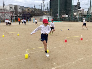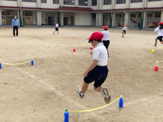 3年生の子どもたちが軽快に走り抜けていきます。ハードル走ですが、先生が作ってくれた手作りハードルを跳び越えていきます。ペットボトルに水を入れてテープで高さを調節しています。これなら引っかかっても痛くないし怖くもないですね。しかも水を色分けしてハードルの間隔にも違いをつけています。子どもたちはテンポよくリズミカルにハードルをクリアしていくためのコツを自ら体感を通して探す活動をしていました。これは高学年のハードル走の技能習得へとつながっていきます。スピードに乗って走れた子どもたちはうれしそうに手をあげて先生に報告していました。