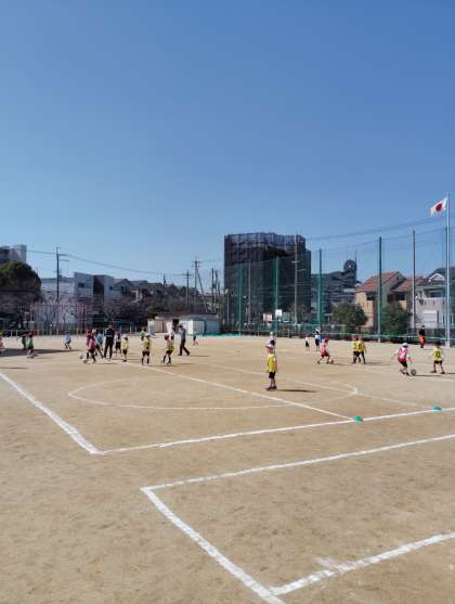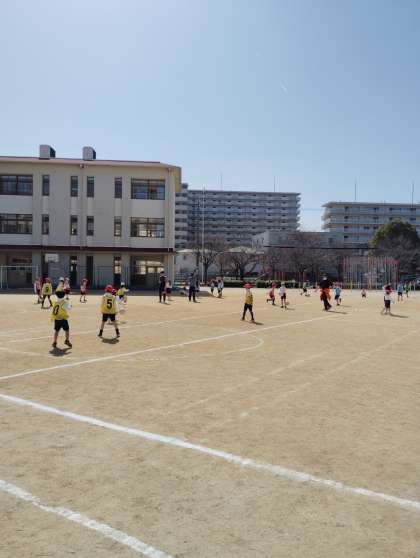 5時間目、春の青空のもと2年生が体育をしています。「ボールけりゲーム」を体いっぱいで楽しみながら取り組んでいます。攻撃チーム、守備チームに分かれゲームをします。やはりボールの扱いに慣れていない子は苦戦しています。ボールが思い通りコントロールできず悪戦苦闘。でも、とっても楽しそうです。それにしても、日差しの下は暑いくらいです。先生達が適宜水分補給の指示を出しています。