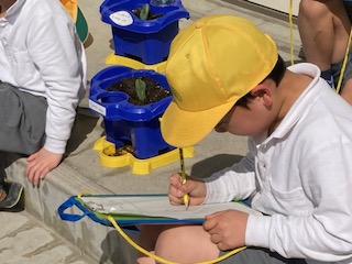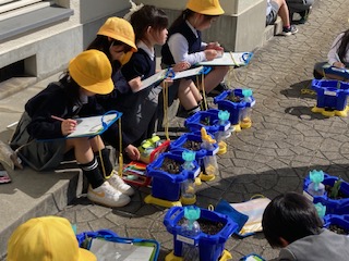 1年生の子どもたちがチューリップの芽を観察していました。『めっちゃ大きくなってきた』『描くのんむずかしいわ』『なんか今日あついわ』…子どもたちは口々に常に何か言いながら観察記録を仕上げていました。『できたー!』『先生あそぼー!』…子どもたちに誘われて鬼ごっこが始まりました。もちろん鬼は先生です。先生が必死に追いかけますが、1年生の子どもたち割と逃げ足がはやいのです。早くも先生はバテ気味でしたが、子どもたちの無邪気な笑い声が芝生広場に広がっていました。