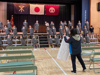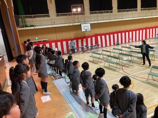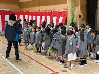 1年生の子どもたちが講堂でお迎えの演技の練習をしていました。これは4月の新1年生の入学式で披露するためのものです。ちょうど1年前は自分たちが見せてもらっていたものを今度は反対に自分たちが見せなくてはならない立場になりました。だから子どもたちはとても張り切っています。先生に言われなくても元気な歌声と大きな動きで表現力ばっちりです。もう1年生とは呼べなくなってしまいますね。