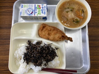 6年生の小学校最後の給食のメニューは、いわしフライ、みそ汁、牛ひじきそぼろ、牛乳、ごはんでした。
