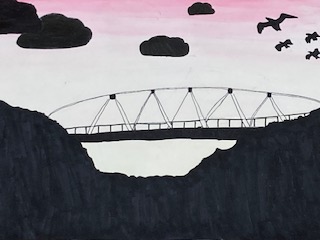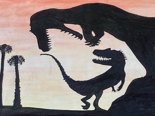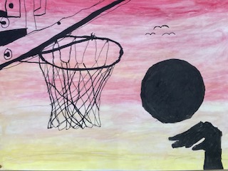 5年生の子どもたちの作品が教室に掲示してありました。テーマは[夕焼けの景色]です。グラデーションで表した夕焼けを背景に黒一色で景色を表現しました。一人一人の表す内容が異なっていて思わず見入ってしまい、一枚一枚楽しむことができました。黒色の部分はサインペンで仕上げたそうです。どれも趣(おもむき)が感じられました。