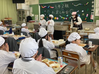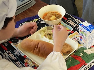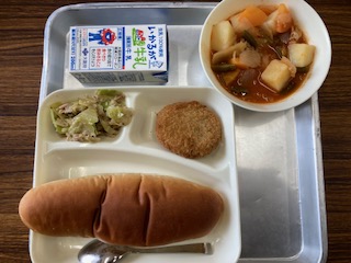 今日の給食のメニューは、チキンレバーカツ、ケチャップ煮、ツナとキャベツのバジルソテー、牛乳、パンでした。今日で令和6年度の給食が終わりました。調理員さんたちも一年間ありがとうございました。特に気温が高い真夏日や冬の寒さが厳しい日は大変だったと思います。おかげで給食を楽しみにしている子どもたちでいっぱいです。保護者の皆さまも子どもたちの栄養指導や食育にご協力いただきありがとうございました。引き続き、令和7年度も安全でおいしい給食を提供していきますので、よろしくお願いします。