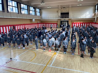 講堂で令和6年度の修了式を行いました。5年生の代表児童に修了証を手渡しました。5年生の子どもたちは在校生の代表として先日の卒業式に出席し、とても立派に頑張っていたこと、4月からは6年生として期待していることを伝えました。そしてすべての学年の子どもたちに一年間の頑張りと大きく成長したことをたくさんほめました。また始業式には希望と期待を抱いて元気に登校してきてほしいと話しました。最後にいつもの『いのち1番、にこにこ2番、3はさっさと片付ける』の話をしました。みんなで大きな声で校歌を歌って修了式を終わりました。
