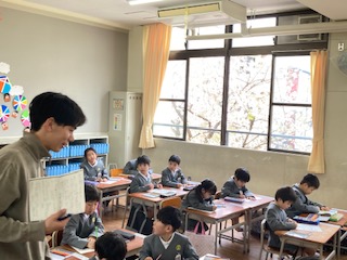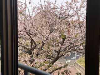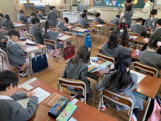 入学したての1年生の子どもたち、小さな机といすにちょこんと座っています。初めての授業は[名前書き]と[ぬり絵]です。どの子も落ち着いて過ごしています。お隣さんとはもう話しましたか。早くお友だちになろうね。先生も自然と笑みがこぼれます。1年生の教室の窓からはちょうど同じ高さに桜の木が見えるベストビューポイントになっています。