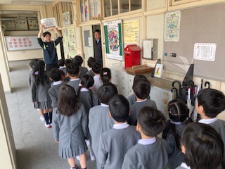 1年生の子どもたちが[校内めぐり]をしていました。1年生の子どもたちが行きそうな職員室や保健室、図書室や体育館などを中心に、みんなで歩いてゾロゾロ見て回ります。詳しくはまた改めて2年生が案内してくれることになっていますので、今日のところは必要に応じて簡単にです。『小学校って広いでしょう?』と声をかけると、『うん、広い。迷子になりそう。』と返してくれました。『とりあえず保健室の場所はしっかり覚えましょう。』と伝えました。