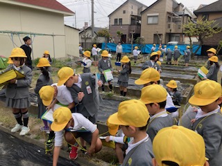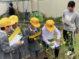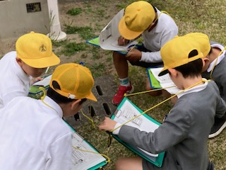 3年生の子どもたちが理科の授業で、春の生き物を探しに芝生広場や学習園に出てきました。暖かくなっていろいろな花が咲き、虫たちも姿を現すようになってきました。上手く観察できるといいですね。先生に観察のポイントを教えてもらって、形や色、大きさなどを特徴的にとらえてプリントに記録していきます。なかなかみんな頑張っていましたよ。先生にほめてもらって、うれしそうな顔をしている子がたくさんいました。