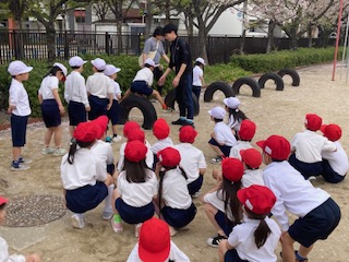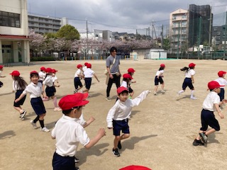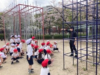1年生の子どもたちが体操服に着替えて初めての体育の時間です。みんなスムーズに体操服に着替えることができました。最初に広い運動場で思いっきり走って鬼ごっこをしました。もちろん鬼は先生です。その他にも遊具での遊び方を教えてもらいました。危ない遊び方はダメです。みんなでゆずり合って楽しく遊んでくださいね。『はーい!』…気持ちのいい返事をする子どもたちでした。