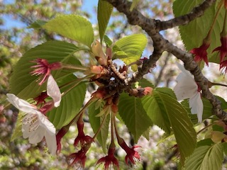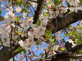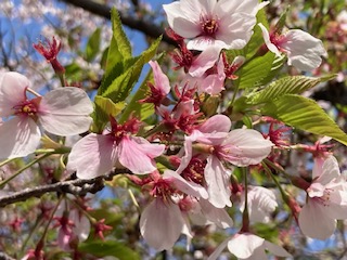 満開だった校庭の桜も少しずつ散り始め、昨日の雨で半分以上の花びらが舞い落ちてしまいました。それでも今年は例年と比べると、長い期間、桜を楽しむことができたように思います。近づいてよく見てみると、若葉が芽吹き始めて新緑の葉も目立つようになってきました。今、校庭の桜も葉桜(はざくら)へと向かっています。次は新緑のまぶしい季節が楽しみですね。