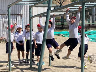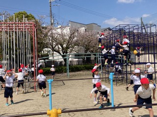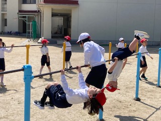 体育の授業で2年生の子どもたちが遊具を中心に元気いっぱいに体を動かしています。[わんぱくランド]というネーミングでどうでしょうか。ただ自由に遊んでいるだけではなくて、それぞれの遊具において課題(目標)が先生から与えられています。それらを達成しなければステージクリアとはなりません。子どもたちは対戦ゲームのようにお互いにスピードも競いながら楽しんで取り組んでいました。