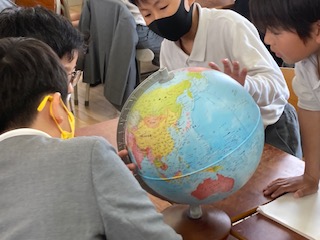 5年生の子どもたちが社会の学習で地球儀を見ていました。『へぇ、地球ってやっぱり丸いんやな。』と今さらながらにつぶやいている子がいました。地球には6つの大きな大陸と3つの大きな海洋があります。世界の中で日本はどこに位置するのだろうか。よく聞く有名な国々の場所はいったいどこにあるのだろうか。日本と近い国、日本から遠い国…、大きな国、小さな国…、子どもたちは意外に世界の位置関係などについて知りません。地球儀を見ながら改めて世界とその中の日本に目を向けることができていました。