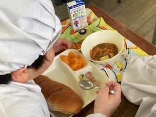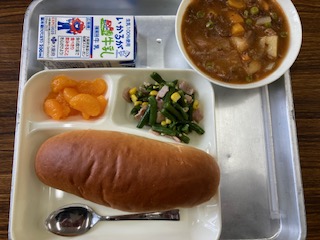 今日の給食のメニューは、ビーフシチュー、ベーコンと三度豆のソテー、みかん(缶)、牛乳、パンでした。ビーフシチューは牛肉の旨みと玉ねぎの甘みが十分に感じられ、じゃがいもやにんじんもやわらかく煮込まれていて、まろやかでおいしかったです。ベーコンと三度豆のソテーはベーコンをから煎りしてから油を加えて三度豆、コーンの順に塩こしょうで炒めています。みかん(缶)は冷たく冷やされていました。