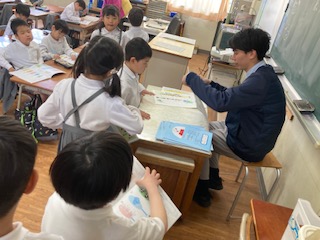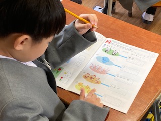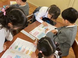 1年生の子どもたちがうれしそうに並んでいます。出された課題ができたら急いで先生のところに並びます。早く先生に見てもらいたくて…○をしてもらいたくて…。『あってたね』『すごいね』と言われるとちょっと得意顔の1年生です。しっかりと自分で考えたりお友だちとも話したりしながら進めることもできます。勉強するのが[楽しい][おもしろい]と思える子どもに育っていってほしいと思います。ぜひご家庭でも子どもたちの学習に目を向け、たくさんほめてあげてほしいと思います。
