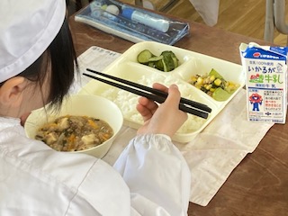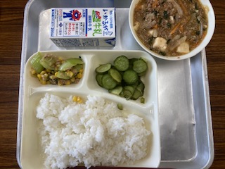 今日の給食のメニューは、麻婆豆腐、きゅうりの中華和え、ツナとチンゲンサイの炒め物、牛乳、ごはんでした。麻婆豆腐は生姜とにんにく、トウバンジャンで香りよく炒めた牛豚ひき肉がたっぷりと入っていて、味付けもちょうどよい辛さで子どもたちが食べやすい感じにととのえられていました。きゅうりの中華和えはごま油の風味がアクセントになっていておいしかったです。ツナとチンゲンサイの炒め物は彩りもきれいで春らしさを感じました。
