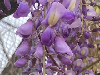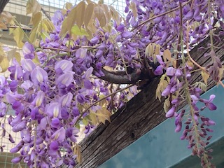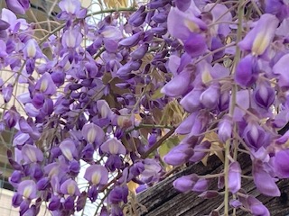 本校の運動場の端に小さいですが藤棚があります。藤棚がある学校はあまり見たことがなく少ないのではないかなと思います。毎年この時期になると、淡く神秘的な紫色の花を咲かせて運動場に彩りを与えてくれます。藤の花は長い花を垂れ下げて咲かせるので幻想的です。品種によって紫以外にも白やピンク、黄色などもあり、本校の藤棚は白色の花も咲かせます。
