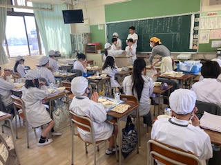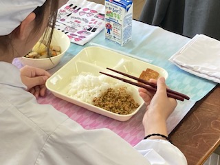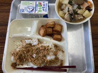 今日の給食のメニューは、鶏肉とじゃがいもの煮物、厚揚げの醤油だれかけ、紅鮭そぼろ、牛乳、ごはんでした。鶏肉とじゃがいもの煮物はしいたけから出るだしが味に深みを与え、具だくさんで彩りも多彩でした。厚揚げの醤油だれかけは焼き物機で焼いた厚揚げに砂糖とみりん、醤油を煮立てて作ったたれをかけています。紅鮭そぼろはごはんにかけて食べるので、ごはんがすすみます。