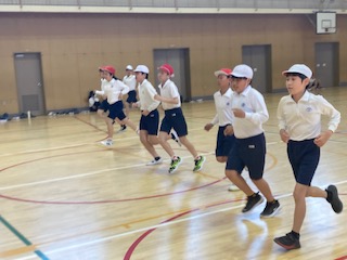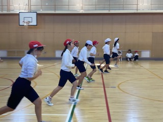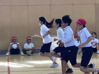 20mシャトルランは体力測定に用いられる運動テストの一つで、20m間隔で引かれた2本の平行線の間を往復する持久走です。CDのリズムに合わせて走り、音が鳴るごとに走るスピードが速くなっていきます。はじめは余裕があるので子どもたちの表情も緩やかなのですが、次第に険しくなってきます。列も呼吸も乱れて限界に達するとリタイアしていきます。最後まで残っている子に見ている友だちから『頑張れー!』と大きな声があがっていました。さあ記録はどうだったかな。5年生の時よりは伸びてないとね。