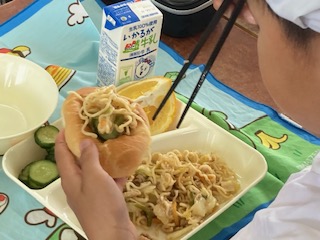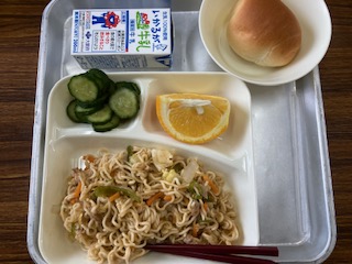 今日の給食のメニューは、焼きそば、きゅうりの生姜づけ、甘夏かん、牛乳、パンでした。焼きそばは豚肉を主材に細かく刻まれた野菜もたっぷり入ったソース味の焼きそばです。子どもたちにも人気のあるメニューです。きゅうりの生姜づけは蒸したきゅうりを生姜汁を使った調味液に漬け込んでいます。甘夏かんは夏みかんよりも酸味が少ないことから[甘夏(あまなつ)]と名付けられ、みずみずしい果肉でさわやかな香りが特徴です。