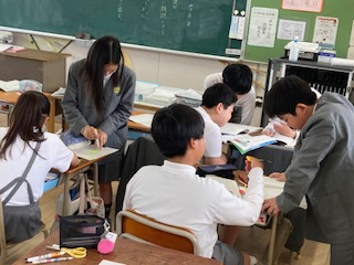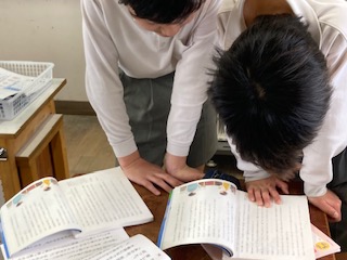 6年生の子どもたちが国語の授業で朗読の練習をしていました。物語に登場する人物の心情の変化や情景を確かめながら読み、とらえたことを聞き手に伝わるように朗読することがめあてです。声の出し方、強弱、読む速さ、間の取り方などに気をつけて読んでいきます。ペアやグループで役割分担をして読んだり、お互いに聞き合ったりしながら練習を進めていきます。子どもたちの主体的に取り組む姿がたくさん見られました。