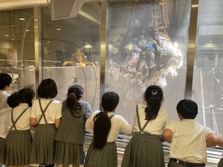 工場内は見学コースが定められていて、ガラス越しに見学することができました。ものすごく大きくて広いごみピット(集められたごみを溜める場所)に入れられたごみを、巨大なクレーンでつかみ取る様子に『まるで怪物UFOキャッチャーや!』と子どもたちは驚きの声をあげていました。わざわざ子どもたちの目の前までごみを吊り下げてくれるデモンストレーションもしてくれました。時間の都合上一部の子になりましたが、クレーンの模擬操作もさせてもらいました。本物のクレーン操作は免許がいるそうです。