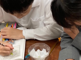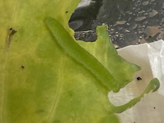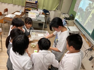 3年生の子どもたちが観察を続けているモンシロチョウの幼虫が大きくなってきました。学習園のキャベツの葉に付いていた黄色くて小さな卵を教室に持ち帰ってきました。それがかえって今では1〜2cmくらいの幼虫になりました。よく見たらキャベツが穴だらけになっています。『めっちゃ食べてるー』『またキャベツ入れないと…』と食欲旺盛の幼虫に子どもたちも喜んでいました。観察シートに記録もしっかりとしていました。
