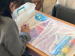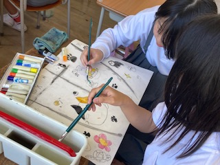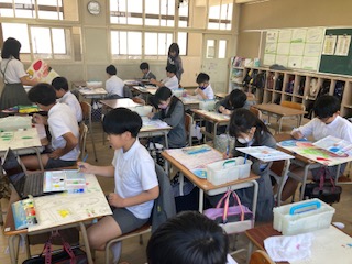 6年生の子どもたちが午後から絵の具をしていました。なんだかのんびりした雰囲気です。カタカタと筆を洗う音だけが聞こえてきます。作品テーマは何でしょうか。みんな慌てるでもなくおしゃべりするわけでもなく、静かでゆったりとした時間が流れている感じだったので話しかけませんでした。のんびり午後の6年生です。