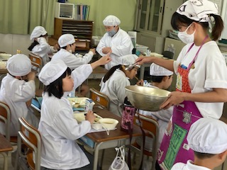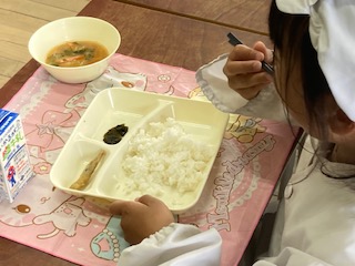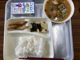 今日の給食のメニューは、きびなごてんぷら、みそ汁、わかたけ煮、牛乳、ごはんでした。きびなごてんぷらはカラッと揚げたきびなごに甘いみつのようなタレがかけられていました。みそ汁は鶏肉とキャベツ、玉ねぎ、にんじん、大根葉が入っていました。わかたけ煮はやわらかく煮られたたけのこにわかめが加えられています。春に収穫されるたけのことわかめは[春先の出会いもの]と言われ、煮物や汁物によく組み合わされています。