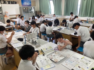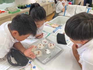 種子が発芽するのにどんな条件が必要なのだろうか。5年生の子どもたちが観察の結果を理科室に持ちよって、みんなで確認をしていました。水を与えた種子と水を与えなかった種子の経過を教室で実験していました。結果は…どのグループも水を与えた方は芽を出していましたが、水を与えなかった方は芽を出していませんでした。種子の発芽には水が必要なことがわかりました。そう言えば種をまいたとき、いつもその後すぐに水やりをしますよね。なるほどですね。他にも条件があるのかな。