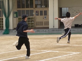 2年生の子どもたちが50m走の記録を計り終わった後、何やら騒がしくなっていました。『せんせーもはしってー』『せんせーもはしってー』…子どもたちのリクエストコールがあがっています。子どもたちが見守る中、T先生とA先生がスタートラインに立ちます。ゴール付近では最高潮の大歓声に変わりました。担任のT先生の勝利に子どもたちは大興奮です。さすがA先生、子どもたちのためにちゃんと心得ていますね(^_^)
