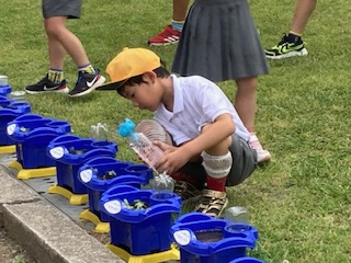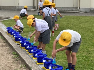 『先生 見て見てー』『芽が出たよー 』『3つも出たよー』…1年生の子どもたちがたくさん声をかけてくれます。みんなで一緒に植えたアサガオの種が芽を出しています。子どもたちは[早く芽が出ないかな]といつも水やりをしていました。そして芽が出てからも今度は[早く大きくならないかな]とやっぱり水やりを欠かしません。これから生活科の学習で観察記録も書いていくと思います。子どもたちのそんな様子を横から見るのがいつも楽しみです。