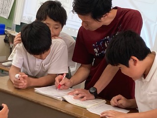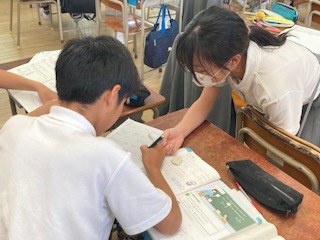 6年生の算数の授業の様子です。子どもたちが互いに自分の考えを伝え合ったり教え合ったりしています。自分の考えを声に出して相手に伝えることで考えを整理し、さらに理解を深めることができます。だから伝えられる側、教えられる側だけでなく伝える側、教える側にもメリットがあります。先生一人ではすべてをフォローすることが難しいときがあります。自然に子どもたちが互いに交流しながら学習が進んでいく形の授業はとても効果的で雰囲気もいいですね。
