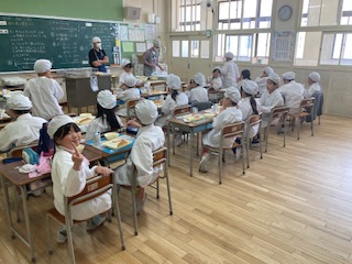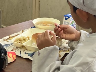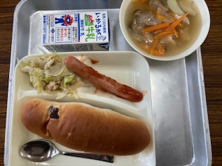 今日の給食のメニューは、ウインナーのケチャップソース、スープ、焼きツナキャベツ、牛乳、パンでした。ウインナーのケチャップソースはゆでたウインナーソーセージにとろみがかった手作りのケチャップソースがかけられています。スープは彩りもよく、チキンスープをベースに塩こしょう、醤油で味がととのえられています。鶏肉と玉ねぎ、にんじん、じゃがいも、しめじ、グリンピースが入っていました。焼きツナキャベツはツナの味が効いているので、一緒にキャベツもたくさん食べられます。
