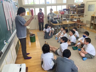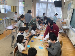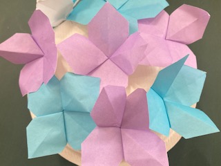なかよし学級のお友だちがみんなであじさい作りです。先生から花の作り方を教えてもらいました。結構難しそうですよ。指先を細かく動かし、しかも小さな折り紙なので子どもたちは悪戦苦闘です。それにあじさいなので何個も作らないといけません。これは協力し合うこと、チームワークが必要となってきます。なかよし学級のお友だちの仲の良さの見せどころですね。お互いに教え合ったり手伝ったりしながら、さあ頑張るぞ。みんなで色あざやかななかよしのあじさいを咲かせましょう。