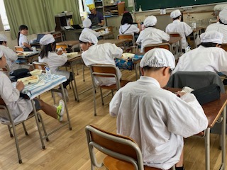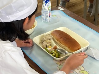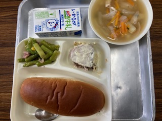 今日の給食のメニューは、かつおのガーリックマリネ焼き、押麦のスープ、グリーンアスパラガスのソテー、牛乳、パンでした。かつおのガーリックマリネ焼きはかつおの切り身をにんにくと塩こしょう、ノンエッグドレッシングで下味をつけて風味よく焼き上げています。押麦のスープは鶏肉で旨みを出して、押麦の他にじゃがいもや玉ねぎなど、野菜もしっかりと入っていました。グリーンアスパラガスのソテーは旬の生のアスパラガスを使い、ベーコンとコーンを混ぜてソテーしています。