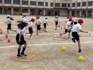 3年生の子どもたちが楽しそうに運動しています。多様な動きをつくる運動として、並べた手作りのミニハードルやフラフープを跳び方や進み方を変えながら連続してクリアしていきます。コースも数通り設定しているので、子どもたちも飽きることがありません。1回5分間続けるので体力向上にもつながります。先生が励ましの声をかける中、子どもたちが躍動する姿が輝いて見えました。