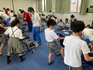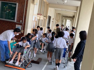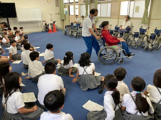 大阪市立心身障がい者リハビリテーションセンターの方々に来ていただいて、3年生の子どもたちに[車いす体験]を行いました。車いす体験を通して、相手に対する思いやりや優しさの気持ちを育ててほしいと思います。介助体験では押される側と押す側の両方の気持ちを体感し、お互いに意見交流をしました。『乗っているときはちょっとこわくて不安だった』『スピードを出し過ぎないように気をつけた』『大丈夫ですかと声をかけてみた』などの感想をもらしていました。みんなで助け合うことのできる3年生に育つと思います。
