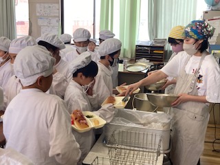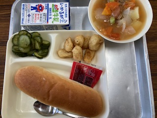 今日の給食のメニューは、いかてんぷら、フレッシュトマトのスープ煮、きゅうりのバジル風味サラダ、牛乳、パンでした。いかてんぷらは角切りの一口サイズで、いかの歯応えもしっかりしていておいしかったです。フレッシュトマトのスープ煮はトマトのさわやかな酸味を生かしたスープで喉ごしがさっぱりとしていました。きゅうりのバジル風味サラダは乾燥バジルを使っていて、バジルには青じそに似た甘い香りと、ほんの少しの辛味があり食欲を増すはたらきがあるそうです。